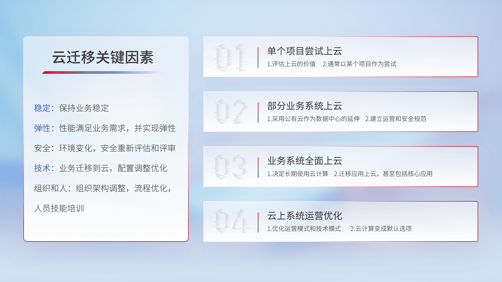 结合实际业务,,从规划设计、、云平台选型、、、云原生改造、、数据迁移、、、、集成交付,,,迁移全过程为客户识别最佳上云路径,,,,做好风险识别管理,,,设计网络架构、、身份权限、、、、安全审计合规、、、、操作审计、、、、日志审计、、、监控告警策略、、、多站点容灾设计等,,,对云上基础设施进行整体规划,,提升IT治理水平,,,以满足弹性、、、、高可用、、、、高性能的需求。。